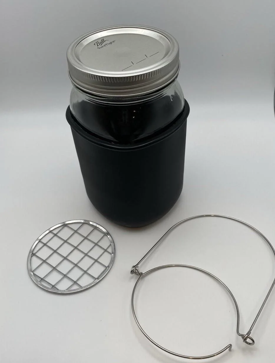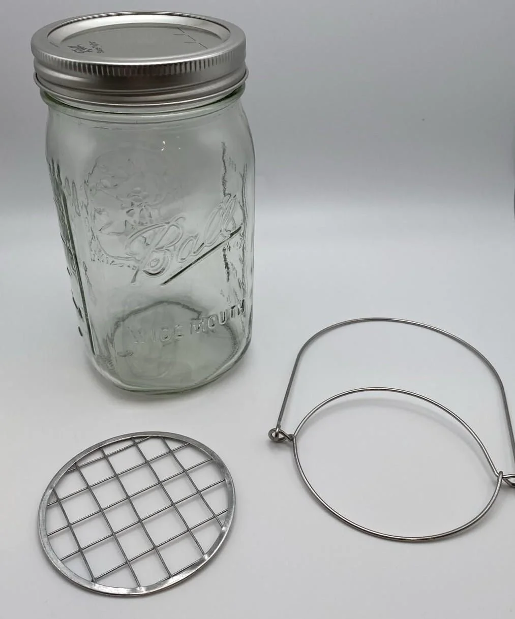 Kit Contains: Quart Mason Jar Wide Mouth, Stainless Steel Rim, Tin Grid Inserts, Silicone Cover, Stainless Steel Hangers, Metal 11.2 Inch Black Rain Cover