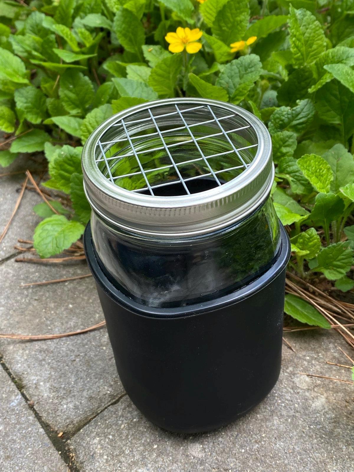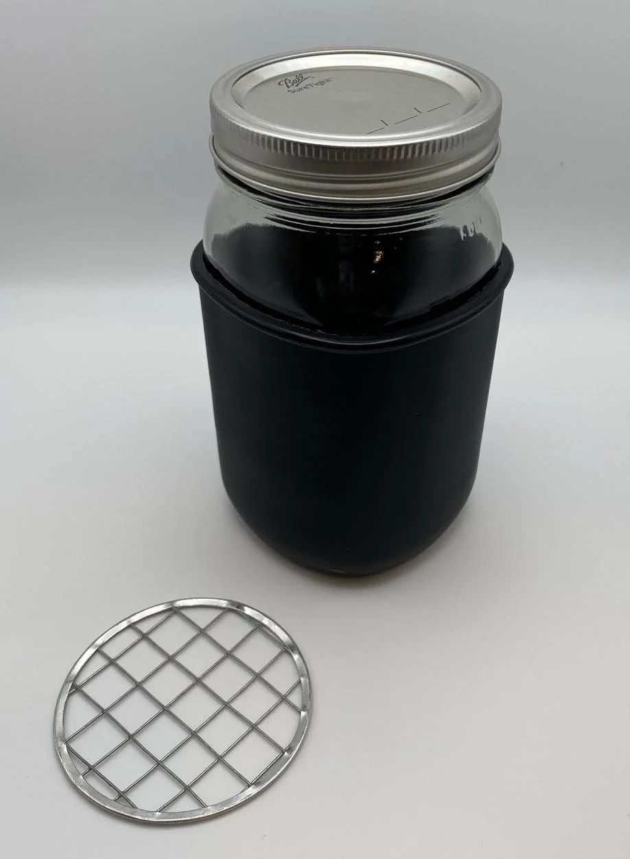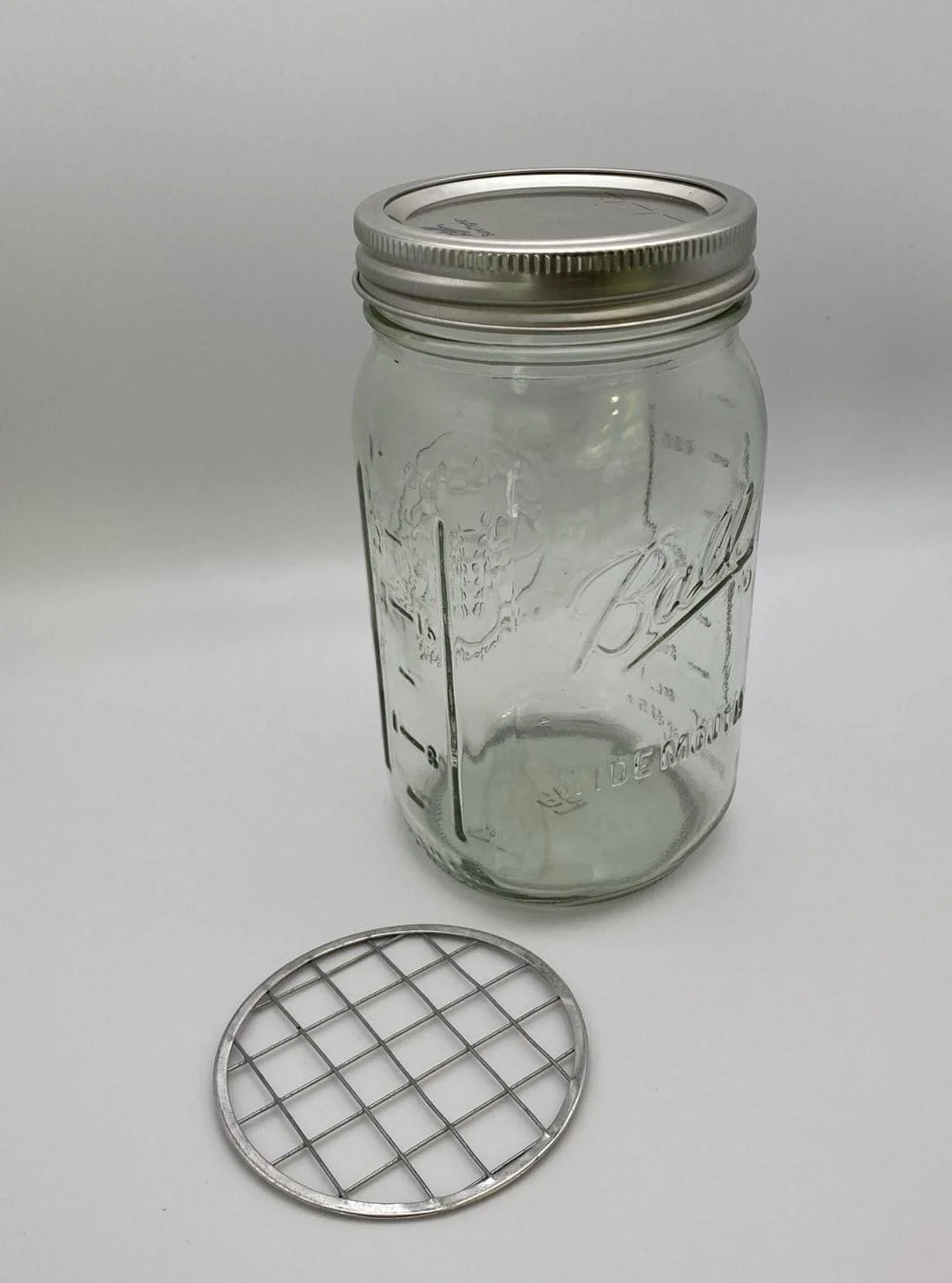 Kit Contains: Quart Mason Jar Wide Mouth, Stainless Steel Rim, Tin Grid Insert, Silicone Cover