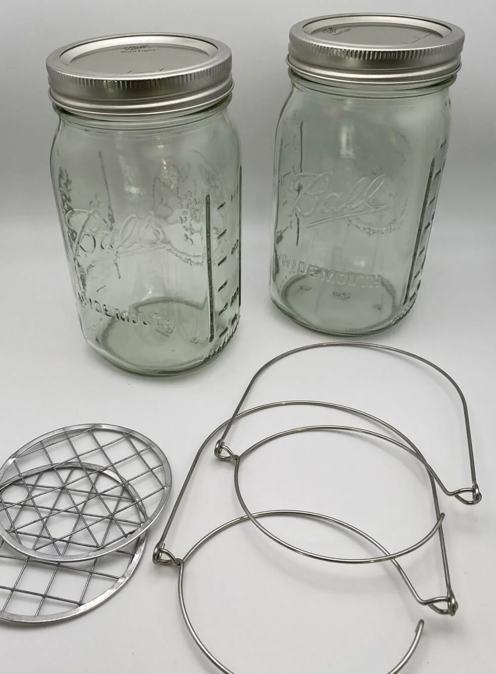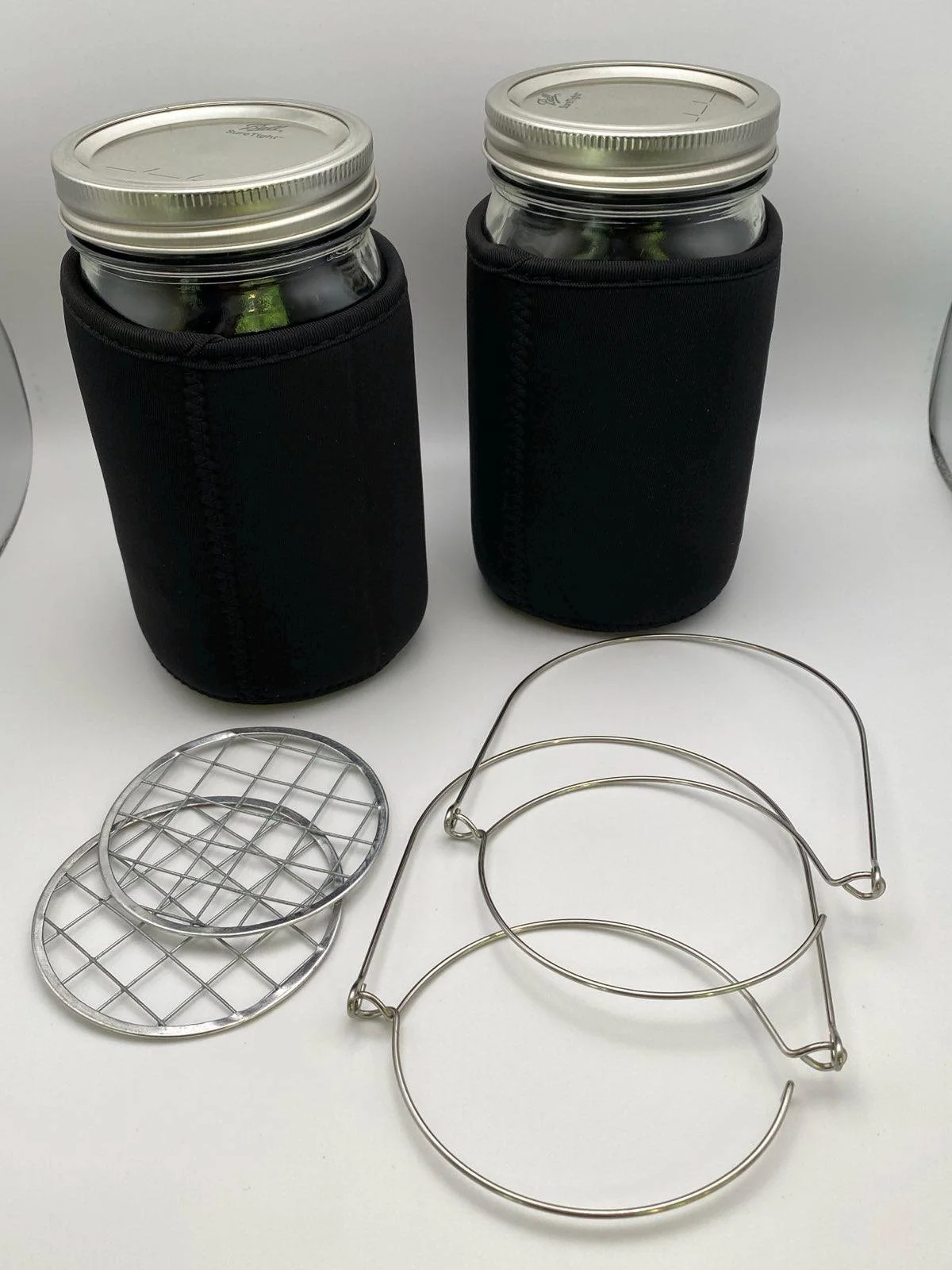 Kit Contains: 2 Quart Mason Jars Wide Mouth, 2 Stainless Steel Rims, 2 Tin Grid Inserts, 2 Neoprene Covers, 2 Stainless Steel Hangers, 2 Metal 11.2 Inch Black Rain Covers